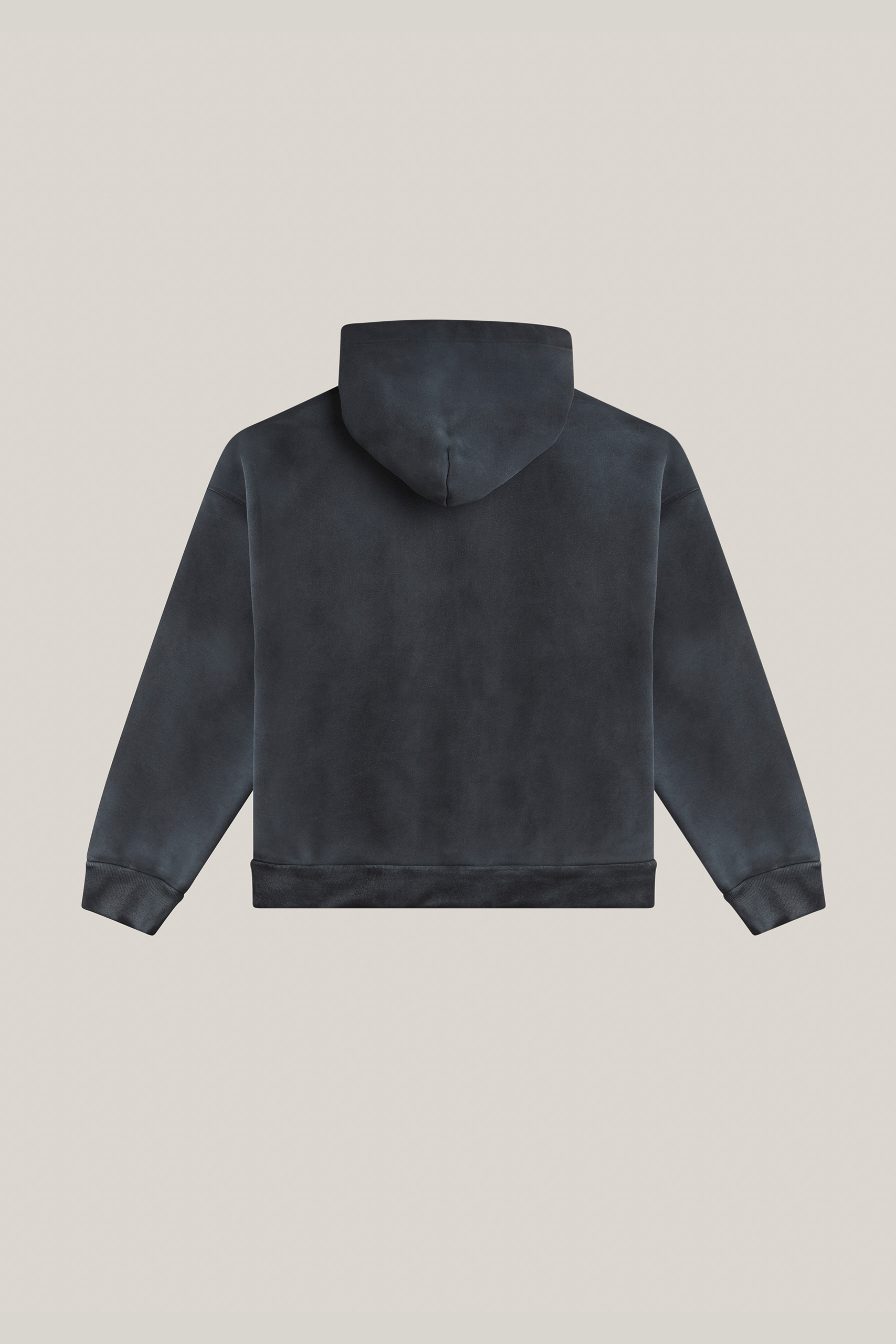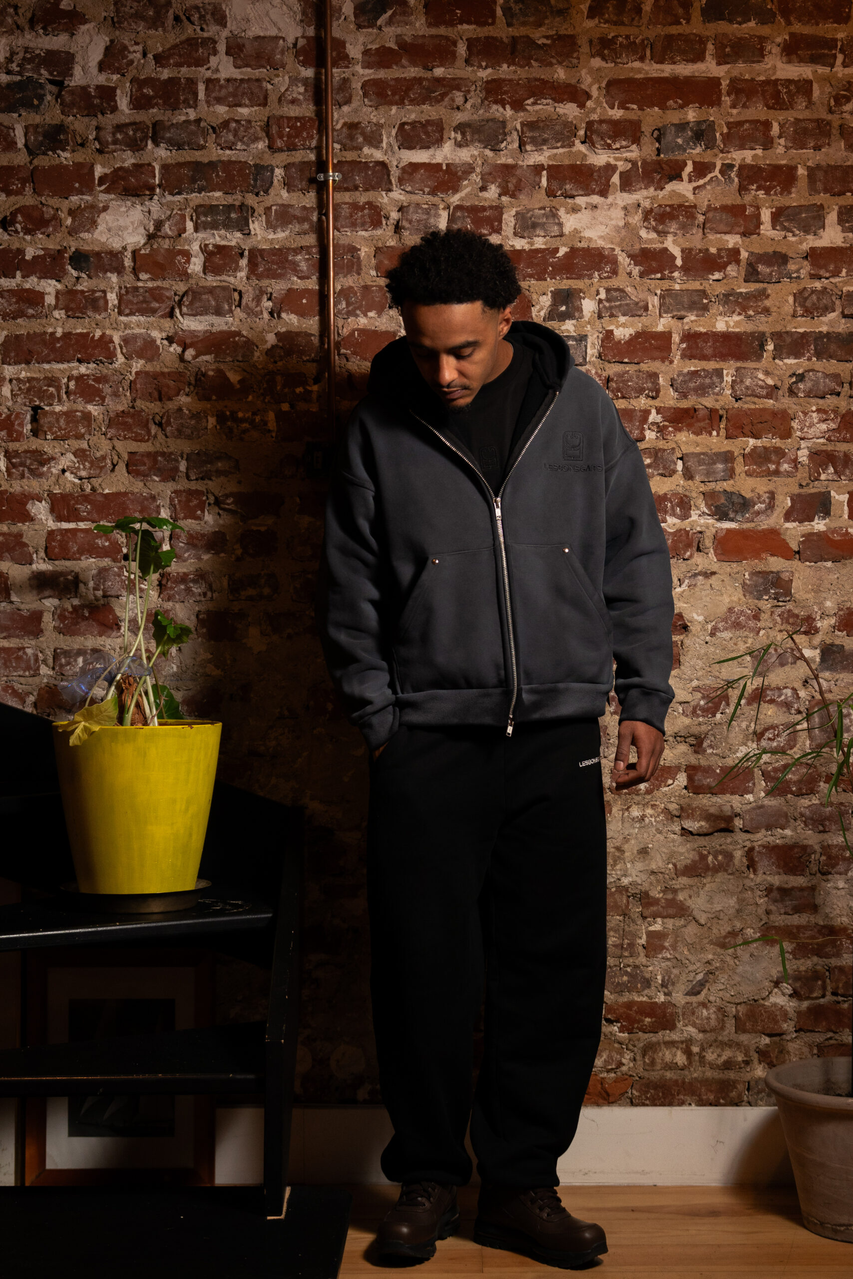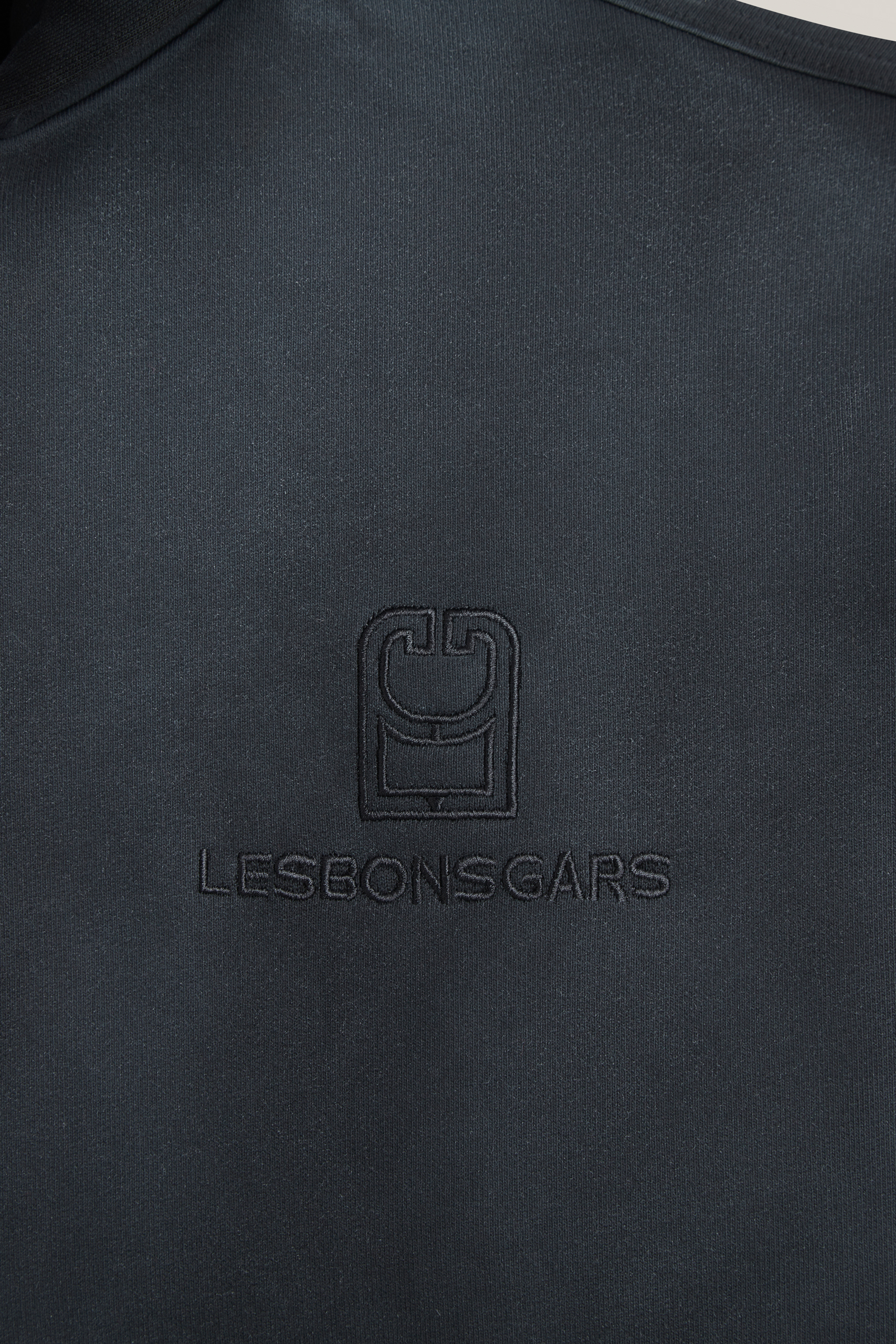 Veste à capuche zippée noire vintage délavée en coton 100%, coupe ample, poids 1 kg, avec deux clous positionnés sur chacune des poches, et le logo « LBG » ainsi que “LES BONS GARS” brodés en relief.