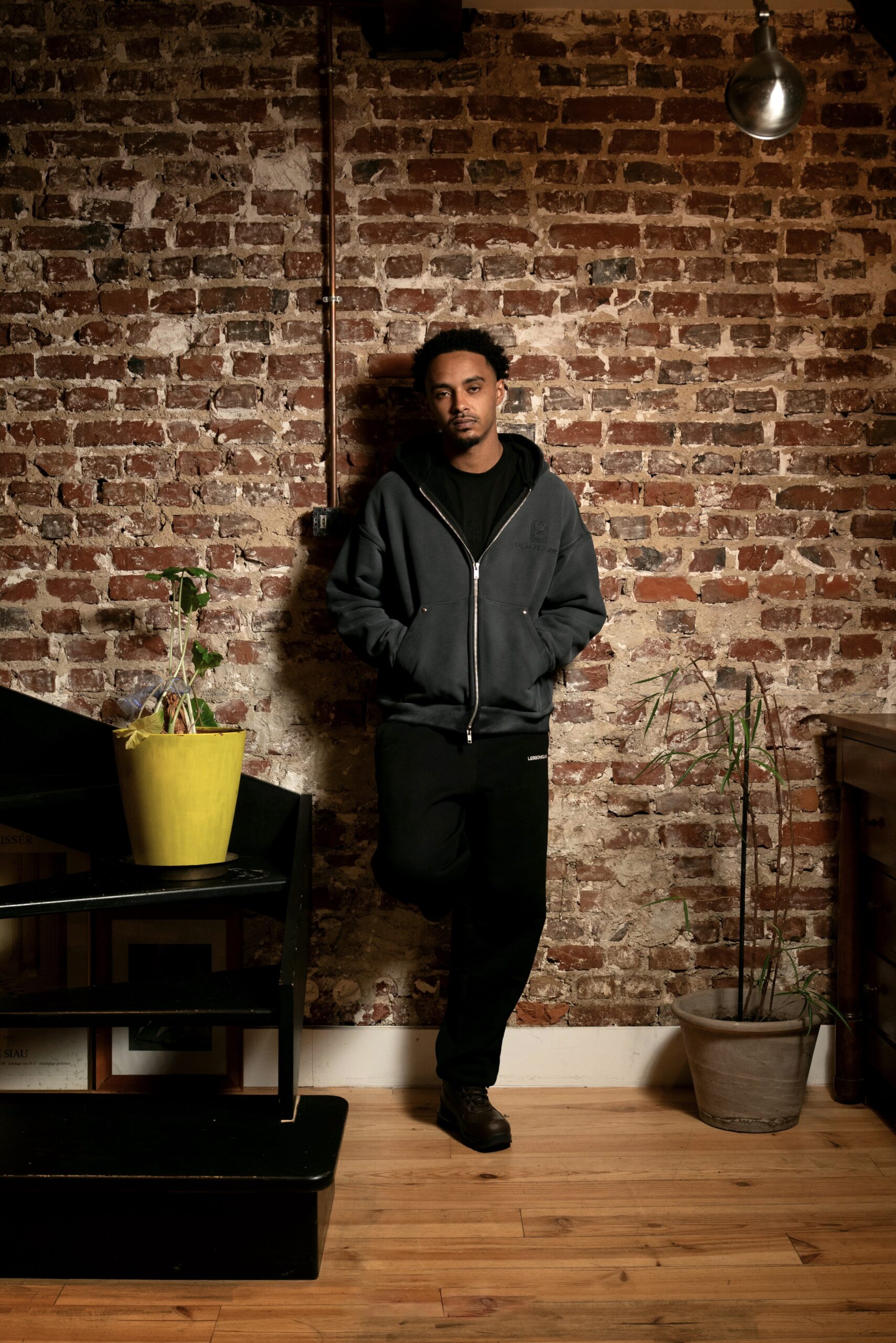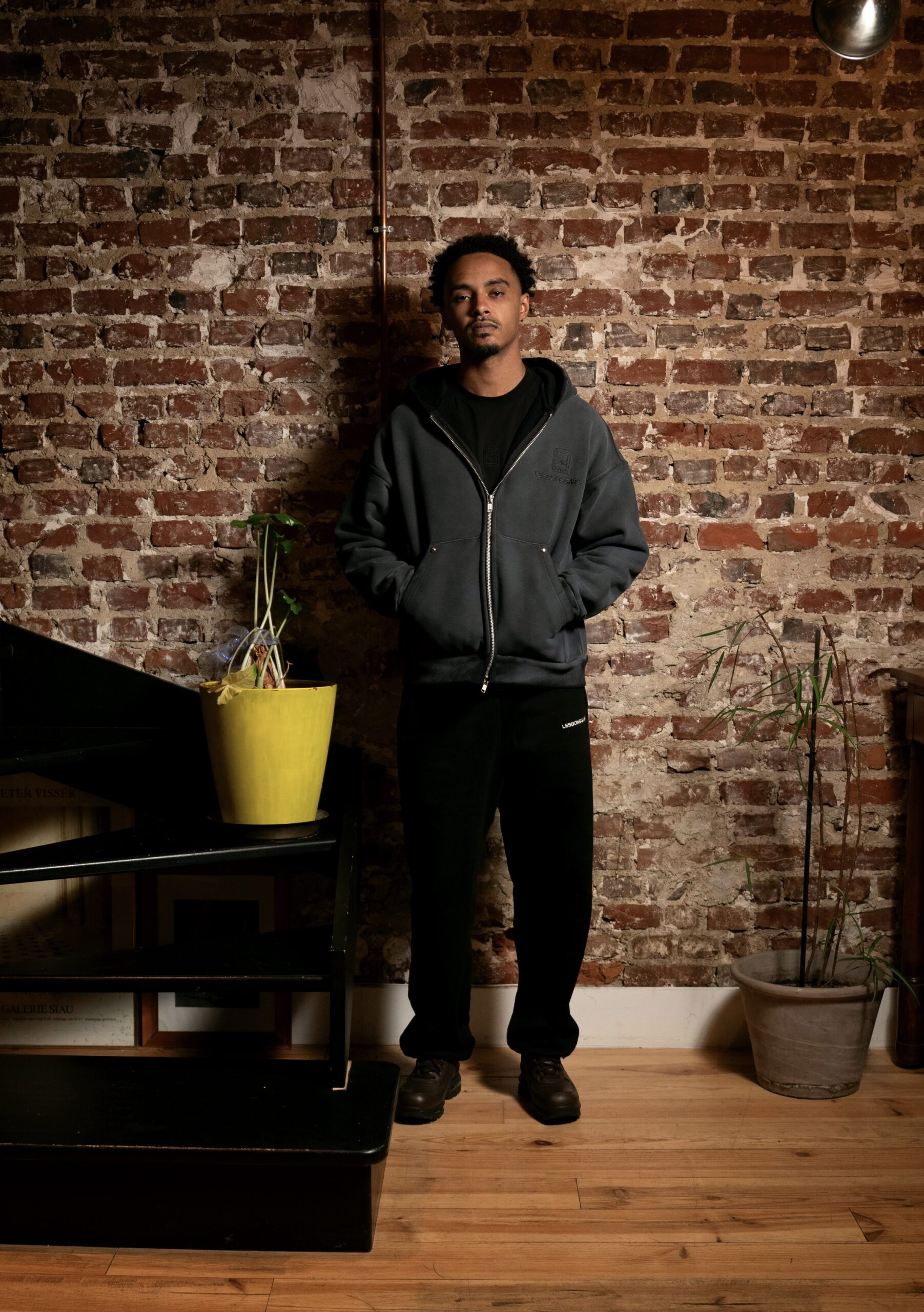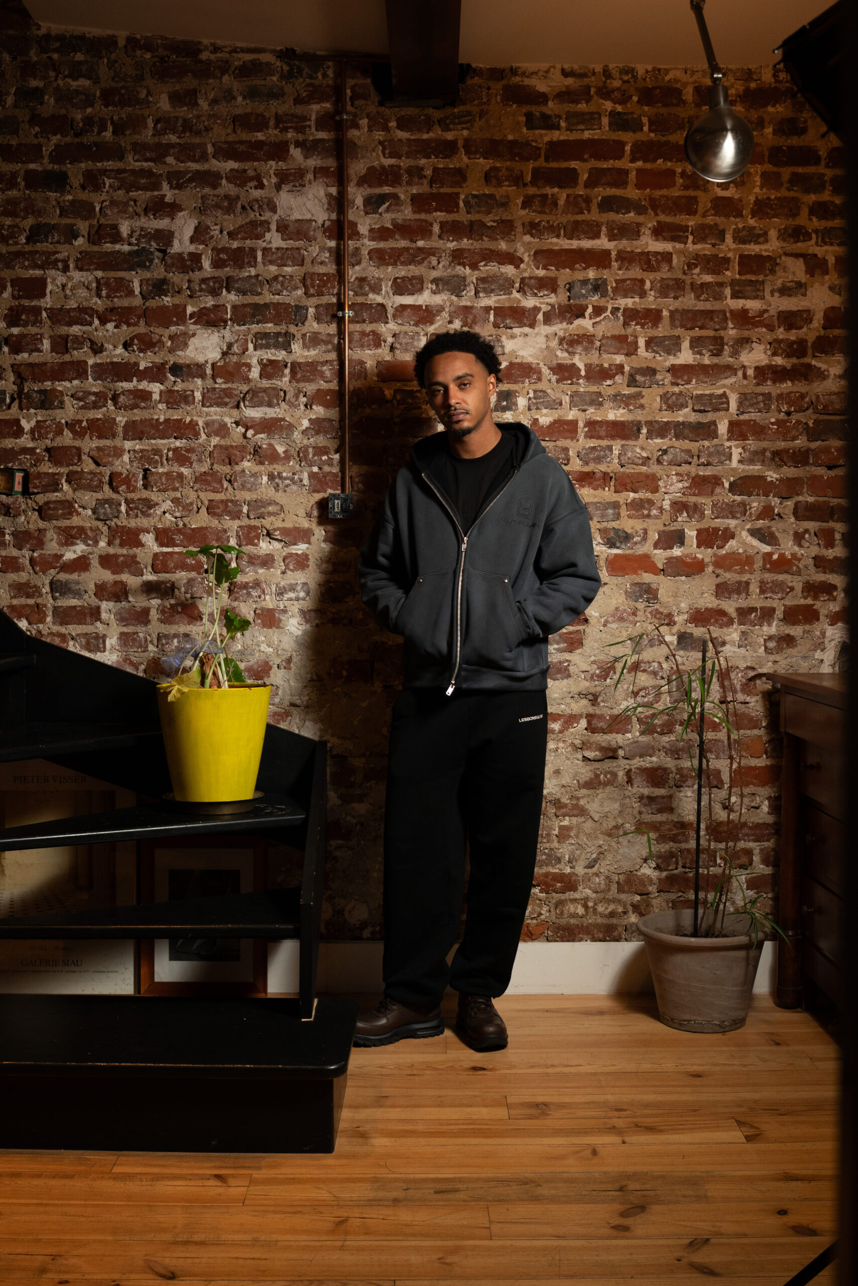 Veste à capuche zippée noire vintage délavée en coton 100%, coupe ample, poids 1 kg, avec deux clous positionnés sur chacune des poches, et le logo « LBG » ainsi que “LES BONS GARS” brodés en relief.